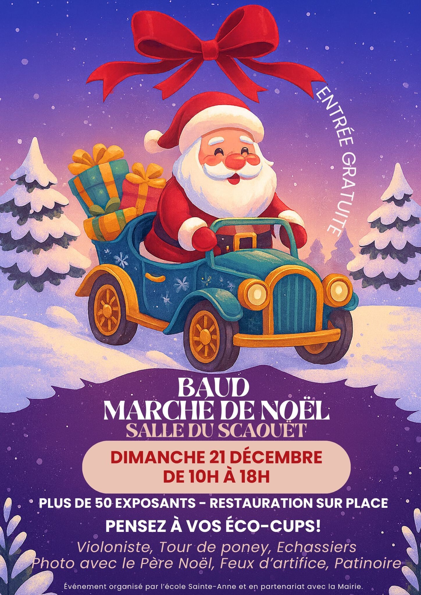 Artisanat d'art et exposants de gourmandises, boissons chaudes et froides, crêpes, biscuits. Photo souvenir avec le Père Noël. Spectacle des enfants. Gratuit
