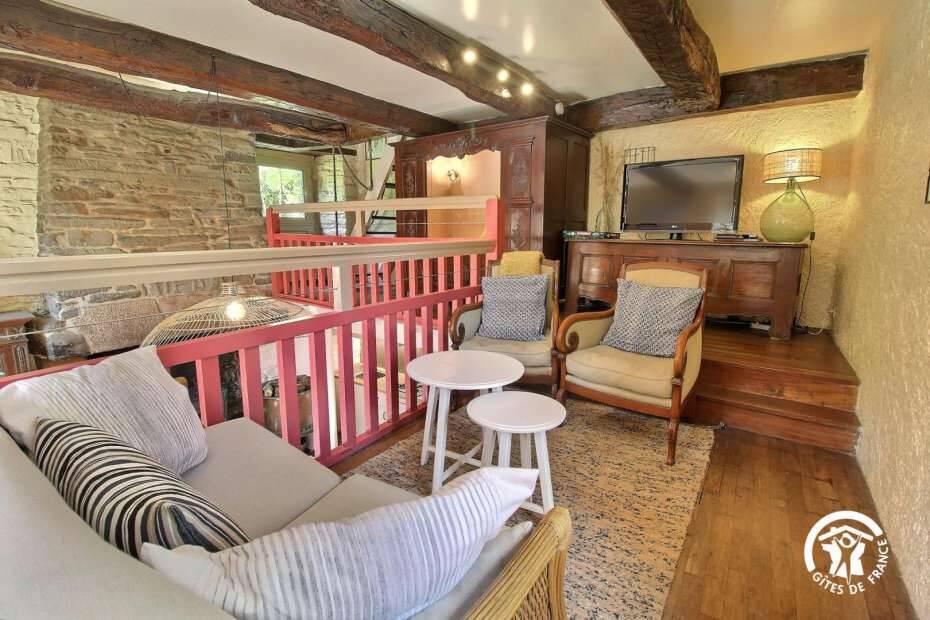 - Au 1er étage : un salon en mezzanine et lit clos (175X80). Accès par un escalier abrupte "échelle de meunier" qui ne convient pas aux personnes à mobilité réduite ainsi qu'aux enfants en très bas âges.